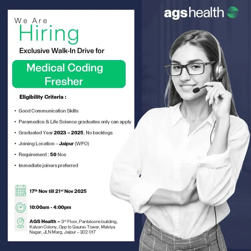AGS Health hiring 50 Medical Coding Freshers in Jaipur. Life Science & Paramedical graduates (2023–2025). Walk-in 17–21 Nov, 10 AM–4 PM.