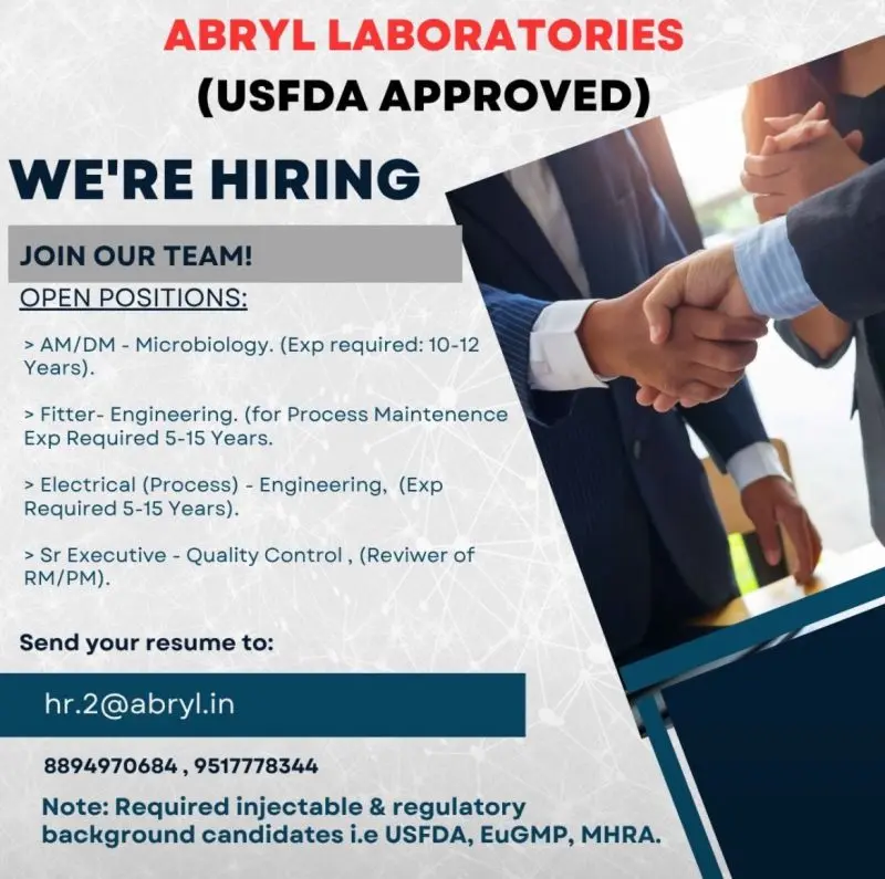 Abryl Laboratories, a leading pharmaceutical company with USFDA, EuGMP, and MHRA approvals, is currently hiring experienced professionals in the fields of Microbiology, Quality Control (QC), and Engineering for its state-of-the-art facility in Ahmedabad. Candidates with a regulatory background and prior experience in injectable facilities are highly preferred.