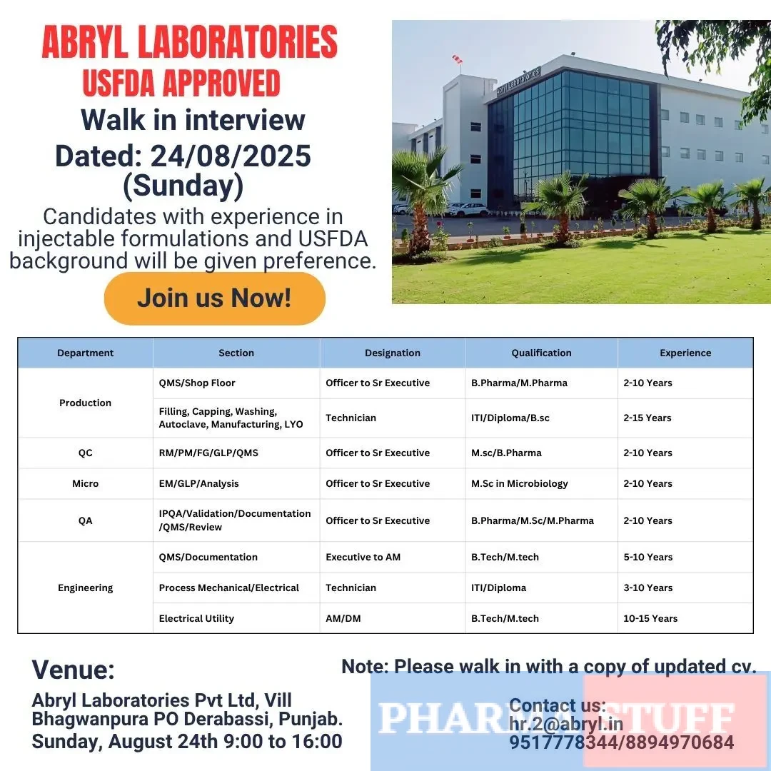 Abryl Laboratories Pvt Ltd, a USFDA-approved pharmaceutical manufacturer, is conducting a large-scale walk-in interview on Sunday, 24 August 2025 in Punjab. The company is seeking experienced professionals across Quality, Production, Microbiology, Engineering, and related functions. Candidates with a background in injectable formulations and USFDA regulatory compliance will be given preference.