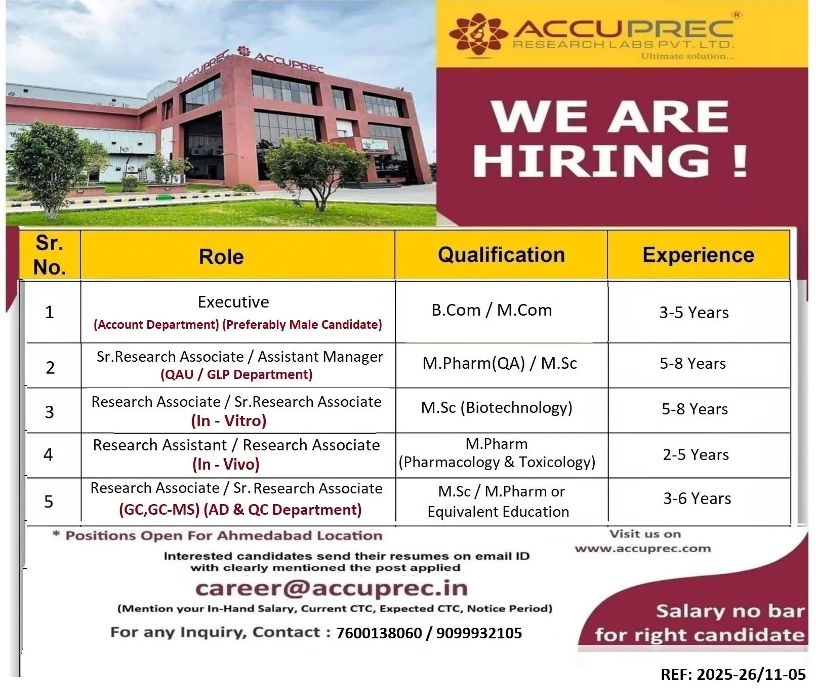 Accuprec Research Labs hiring for Accounts Executive and Sr. Research roles. Vacancies for B.Com/M.Com & M.Pharm candidates.