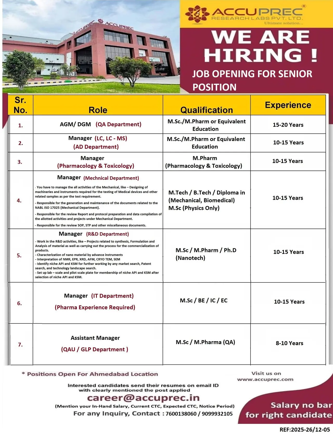 Accuprec Research Labs Pvt. Ltd. has announced senior-level job openings at its Ahmedabad facility for highly experienced professionals across Quality Assurance, Analytical Development, R&D, Pharmacology & Toxicology, Mechanical Engineering, IT, and GLP Quality Assurance functions. These opportunities are intended for professionals who have built strong technical careers and are now ready to lead, mentor teams, and drive regulated scientific operations.
