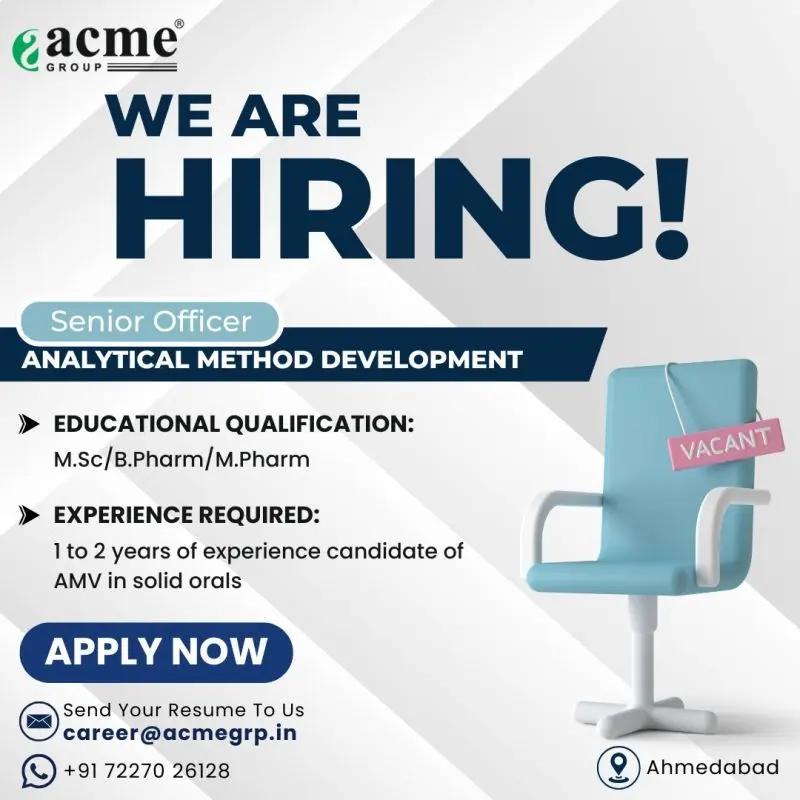 Acme is hiring a Senior Officer for Analytical Method Development. This role suits candidates with hands-on AMV experience in solid oral dosage forms. The position focuses on method development, validation and analytical support for new and existing products. This is a strong opportunity for professionals looking to advance in a regulated pharma environment.