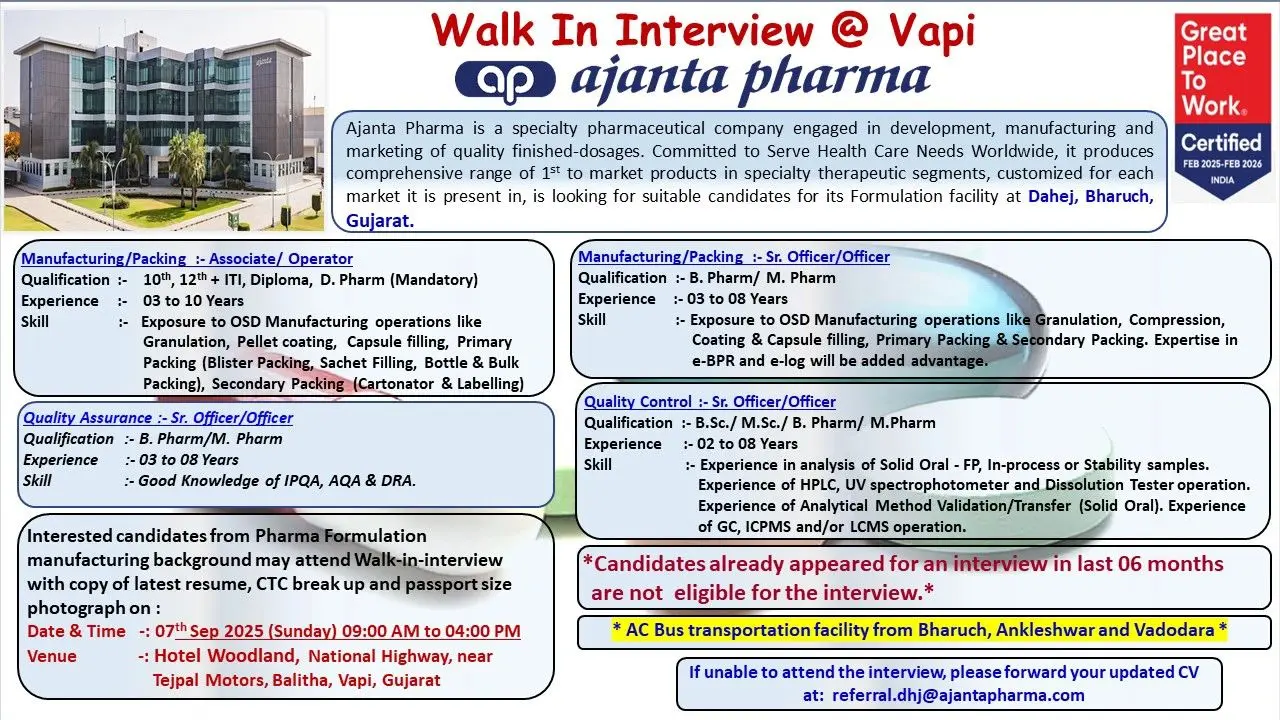 Ajanta Pharma, a Great Place To Work Certified global specialty pharmaceutical company, is conducting a Walk-In Interview in Vapi, Gujarat for multiple roles in Manufacturing, Packing, Quality Assurance (QA), and Quality Control (QC). This is an excellent opportunity to build your pharma career with a company that leads innovation and compliance in formulations and dosage forms.