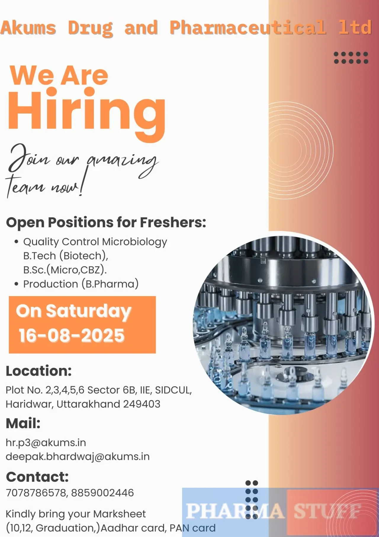 Akums Drug and Pharmaceutical Ltd, a renowned pharmaceutical company, is inviting freshers to join its dynamic team. Openings are available for Quality Control Microbiology and Production departments. The recruitment will be held on 16-08-2025 (Saturday) at the company location in Haridwar.
