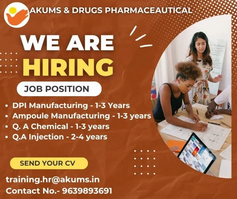 Apply for DPI, Ampoule, QA Chemical & QA Injection roles at Akums Pharmaceuticals. 1–4 years experience required.