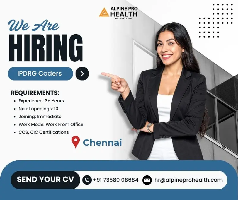 Alpine Pro Health is actively hiring experienced IPDRG Coders for its Chennai office through an immediate recruitment drive. While many candidates search for large-scale opportunities like Dr.Reddy’s Recruitment Drive in pharma and healthcare sectors, this hiring drive offers a strong and stable career path in medical coding, clinical documentation, and healthcare revenue cycle management.