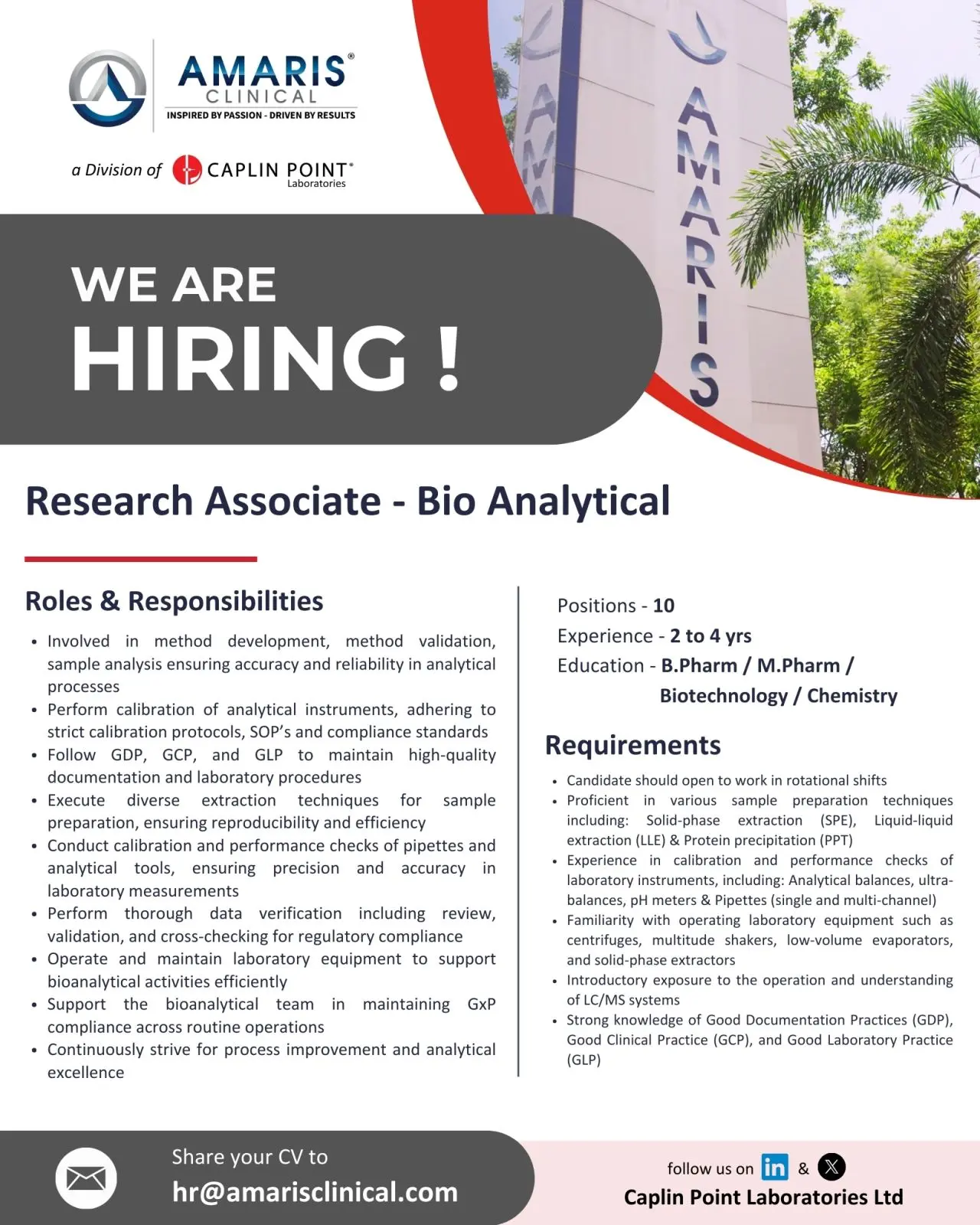 Amaris Clinical, a division of Caplin Point Laboratories, is inviting applications for the position of Research Associate – Bioanalytical at its Ambernath, Maharashtra facility. This is a remarkable opportunity for experienced professionals to join a globally recognized pharmaceutical organization known for excellence in bioanalytical research and innovation.