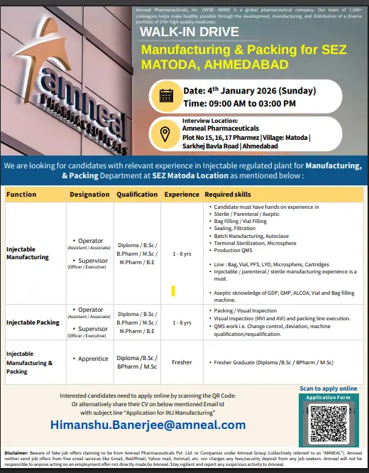 Amneal Pharmaceuticals is conducting a walk-in drive for experienced and entry-level professionals at its SEZ Matoda facility in Ahmedabad. This hiring initiative targets candidates with exposure to sterile and injectable manufacturing and packing operations within a regulated pharmaceutical environment. The drive is ideal for professionals seeking injectable manufacturing jobs, pharma walk-in interviews in Ahmedabad, and long-term careers in USFDA-compliant facilities.