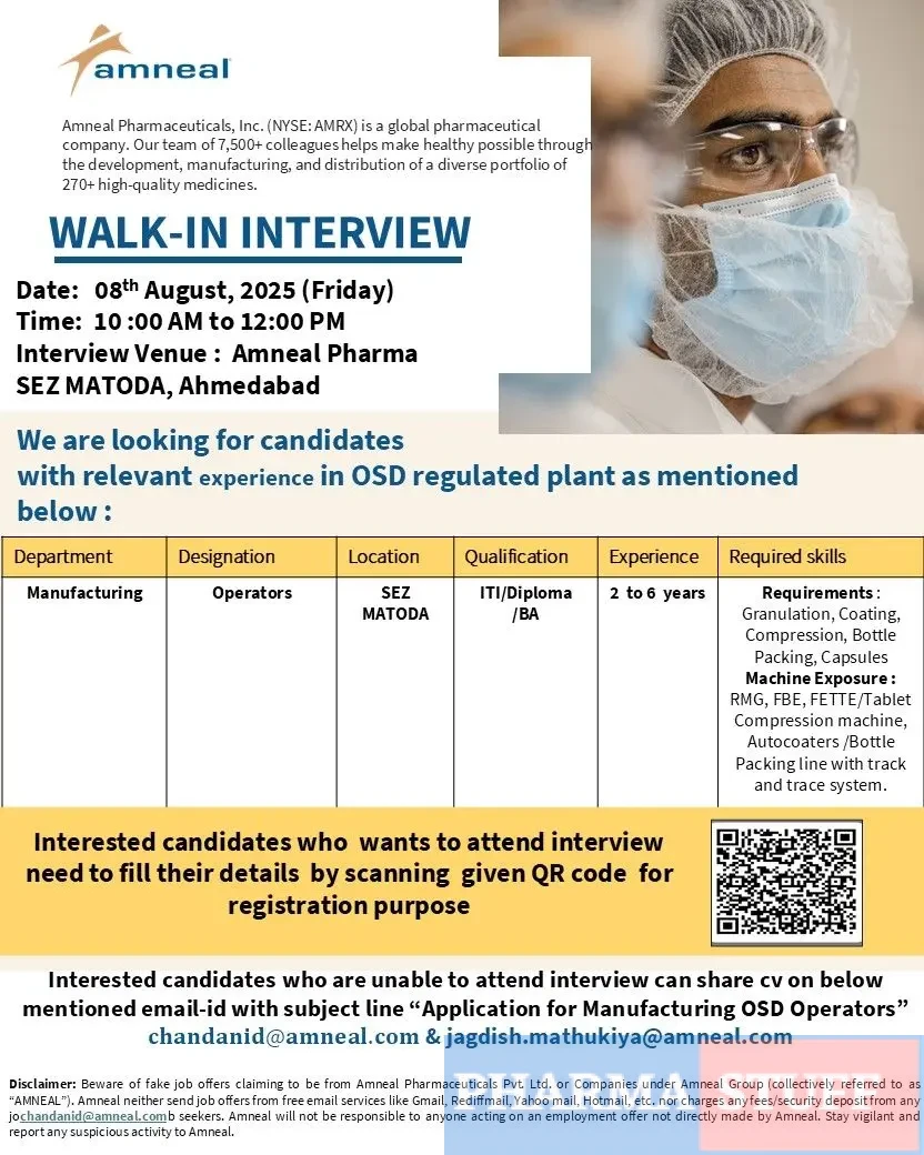 Amneal Pharmaceuticals, a leading name in the global pharmaceutical industry with over 7,500 employees and 270+ products, is conducting walk-in interviews for its Oral Solid Dosage (OSD) manufacturing unit in SEZ Matoda, Ahmedabad. This is an exciting opportunity for experienced professionals holding ITI, Diploma, or BA qualifications to work in a world-class regulated plant.