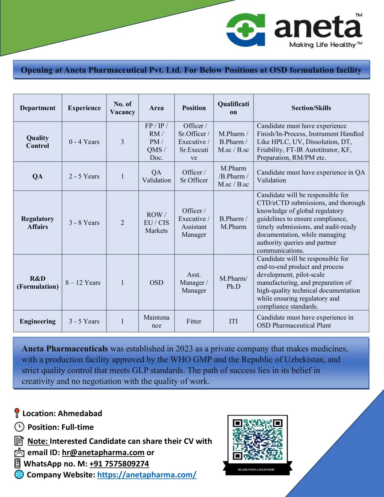 Aneta Pharmaceuticals Pvt. Ltd. is hiring skilled professionals for its Oral Solid Dosage (OSD) formulation facility in Ahmedabad. The company is expanding its quality, regulatory, research, and engineering teams and is inviting qualified candidates who want to work in a WHO-GMP–approved manufacturing environment focused on global compliance and product excellence.