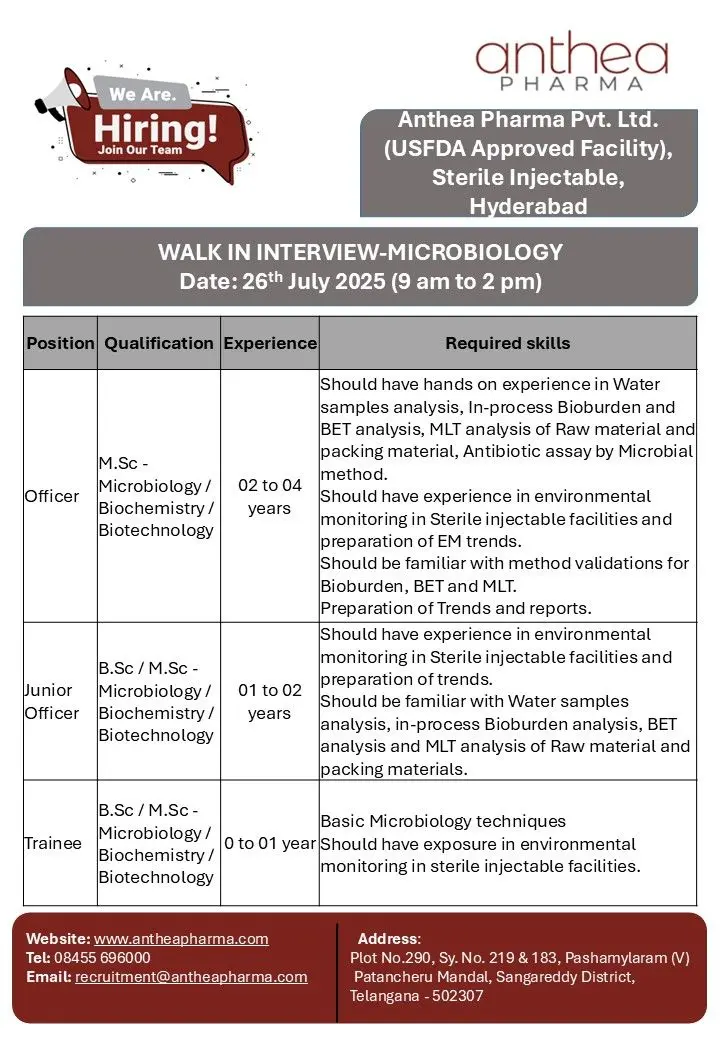 Anthea Pharma Pvt. Ltd., a USFDA-approved sterile injectable pharmaceutical facility, is hiring qualified microbiology professionals. The company is organizing a walk-in interview to recruit talent for its Microbiology Department. This is an excellent opportunity for BSc and MSc graduates in Microbiology, Biochemistry, or Biotechnology, looking for stable careers in Hyderabad’s growing pharma ecosystem.