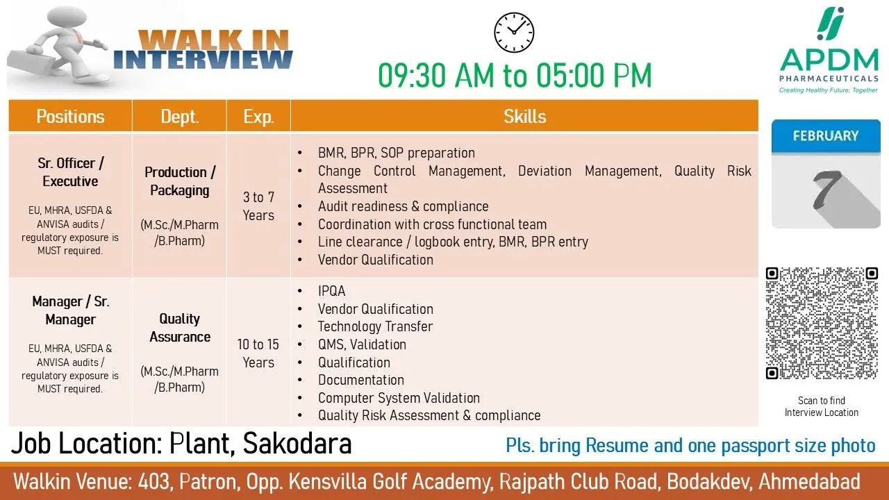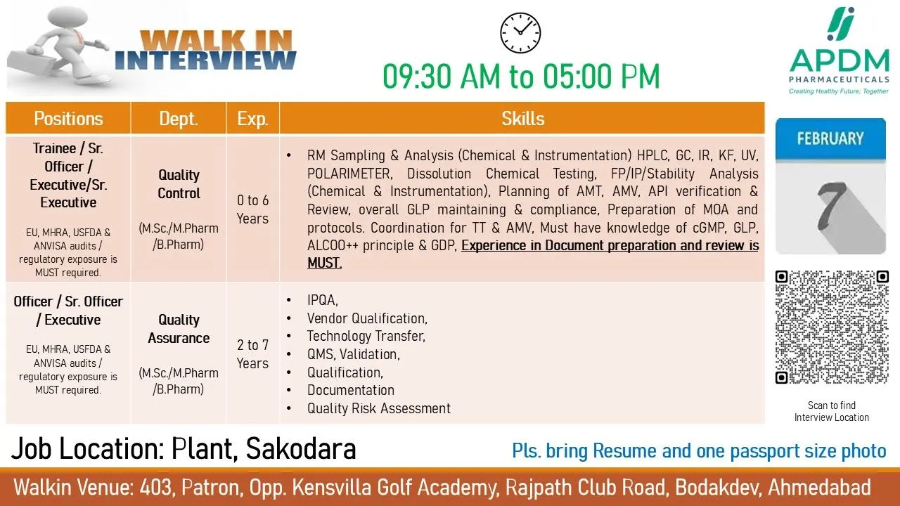 APDM Pharmaceuticals hiring BPharm, MPharm, MSc candidates for QA, QC, Production roles in Sakodara. Walk-in interview openings.