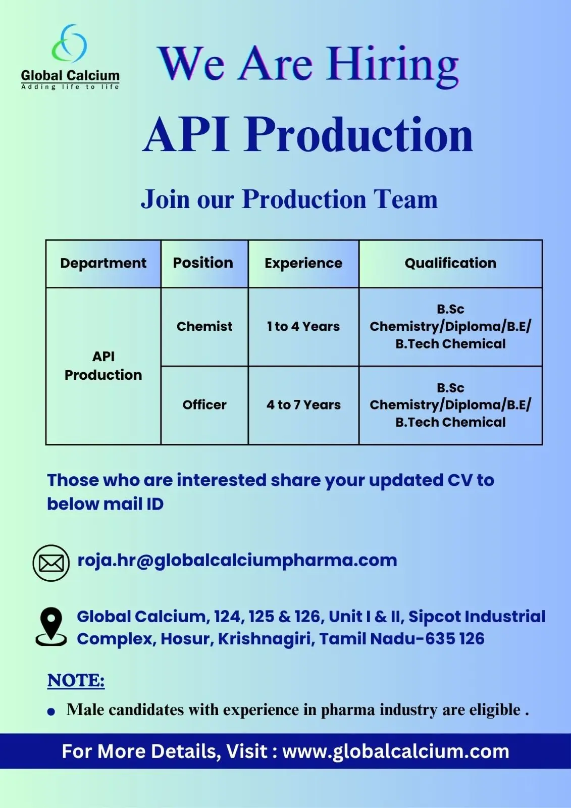 - Exciting Career Opportunities in API Production at Global Calcium, Hosur