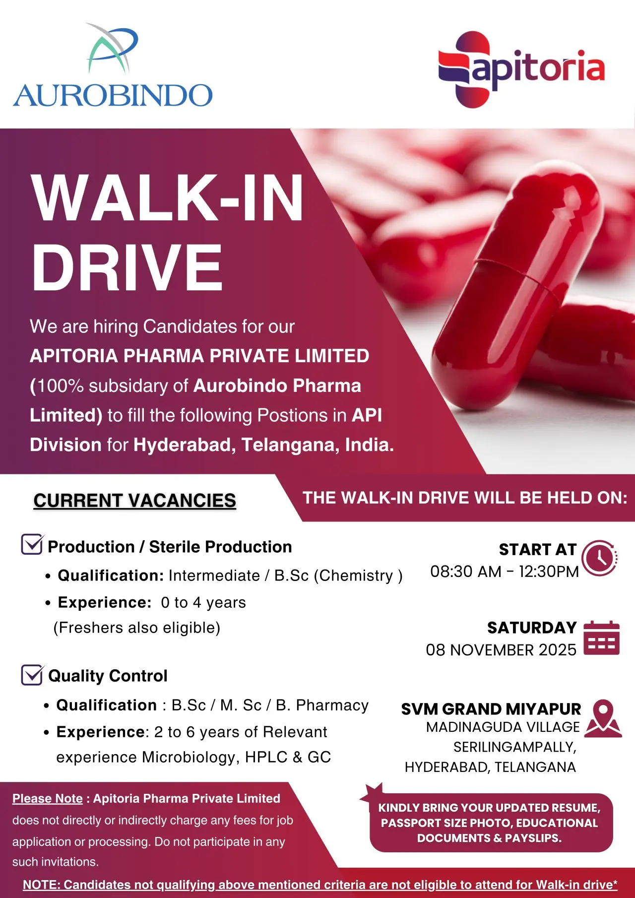 Meta Description: Attend Apitoria Pharma (Aurobindo Group) Walk-In Drive in Hyderabad for Production & QC roles. Open for B.Sc, M.Sc, B.Pharm with 0–6 years experience.