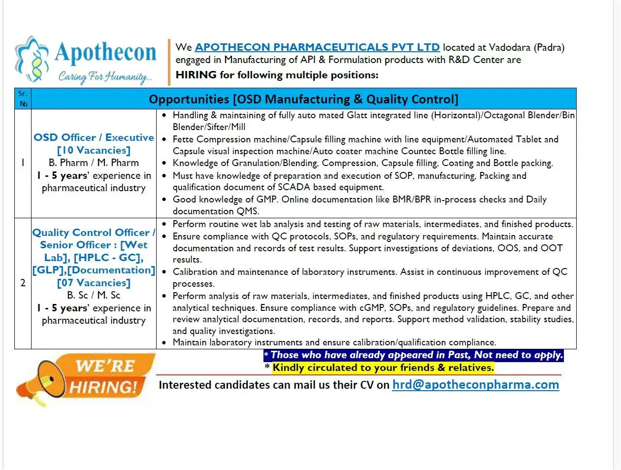 Apothecon Pharmaceuticals Hiring 17+ Vacancies | OSD Manufacturing & QC Roles in Vadodara