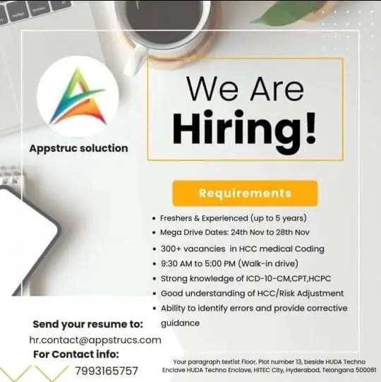 Appstruc Solution is running a mega hiring drive for HCC medical coders in Hyderabad. The company seeks 300+ candidates, both freshers and professionals with up to 5 years’ experience, who are proficient in ICD‑10‑CM, CPT and HCPCS and have a good understanding of HCC/risk adjustment coding. This on‑site recruitment event offers immediate interview opportunities, training pathways and career growth in clinical documentation and revenue cycle roles.