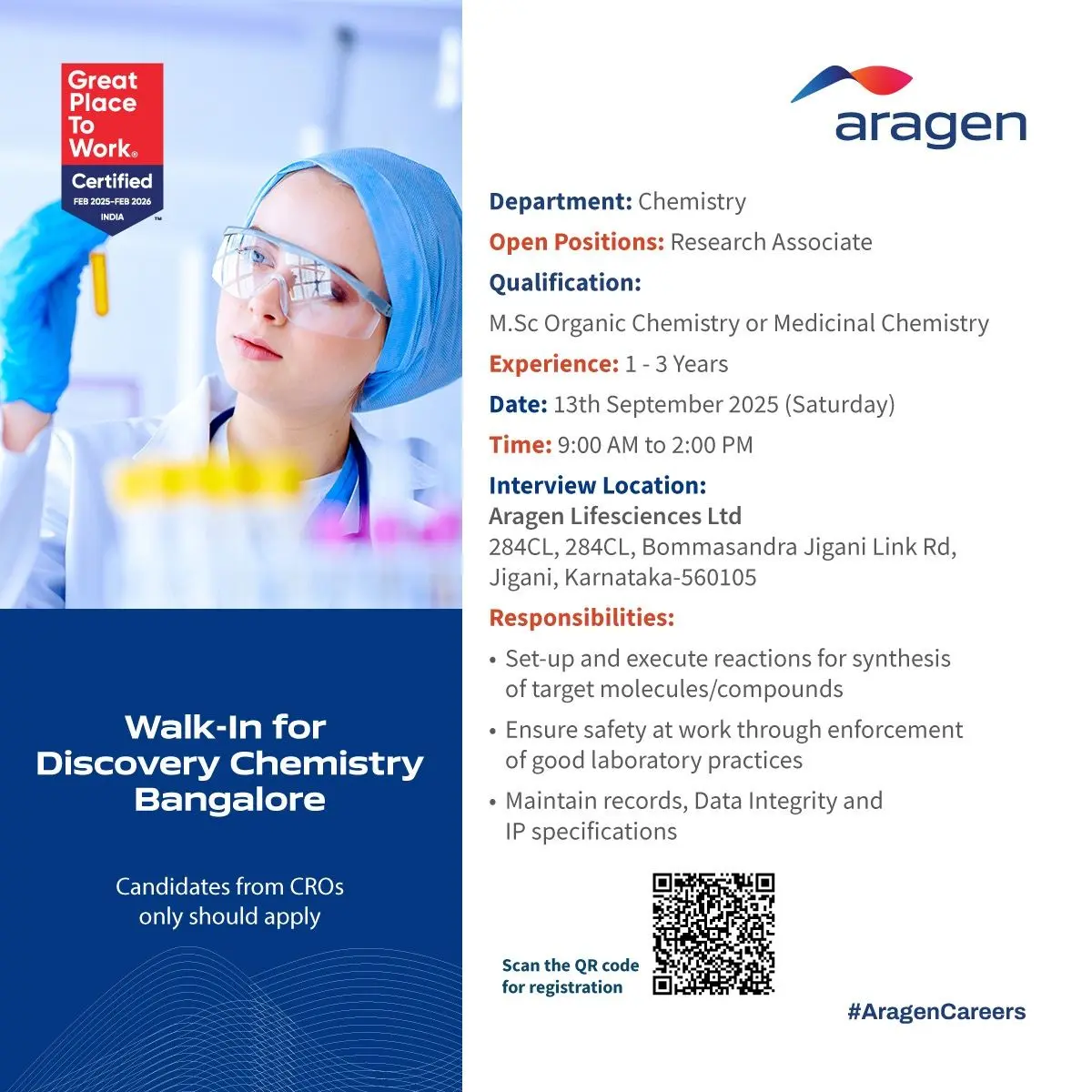 Aragen hiring M.Sc Chemistry graduates with 1–3 yrs experience for Research Associate roles. Walk-in on 13 Sept 2025 at Bangalore.