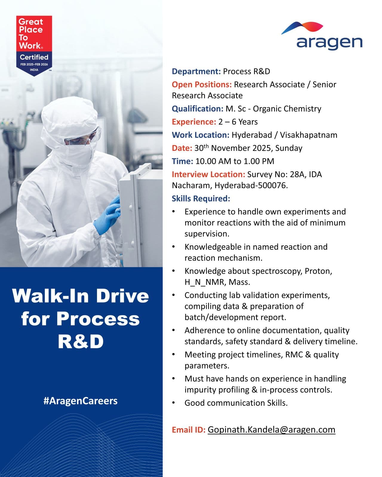 Aragen walk-in for M.Sc Organic Chemistry candidates for Process R&D roles. 2–6 years experience. Hyderabad & Vizag.