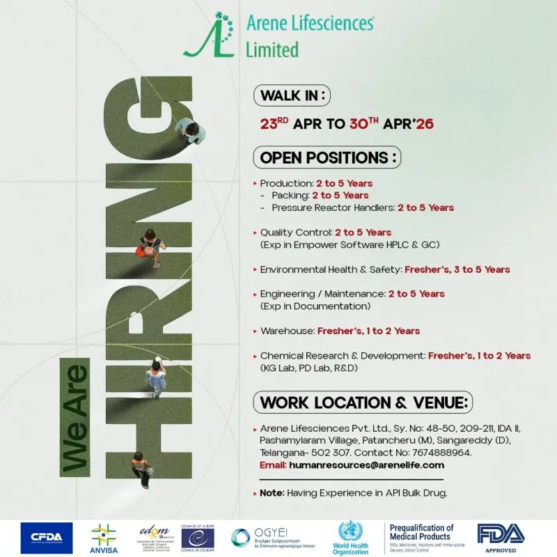 Arene Lifesciences Limited is conducting a walk-in drive for multiple roles across Production, Packing, Quality Control, EHS, Engineering, Warehouse, and R&D. If you are targeting API pharma jobs in Hyderabad, bulk drug manufacturing roles, or entry to mid-level opportunities in GMP-regulated plants, this drive is a practical route to secure a position.