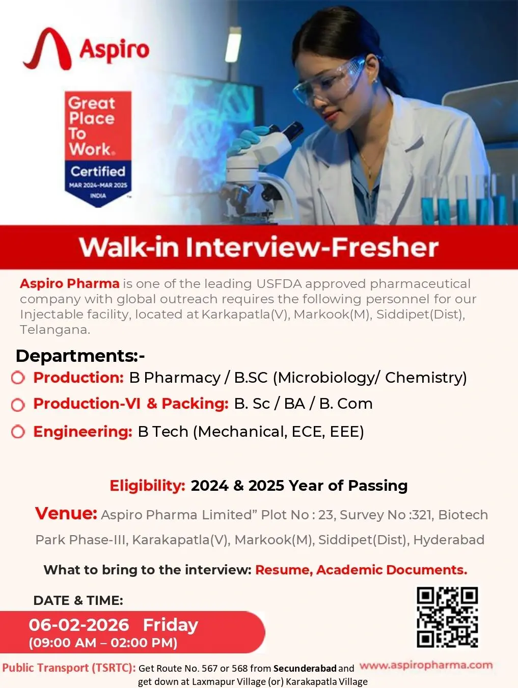 Aspiro Pharma Limited has announced a dedicated walk-in interview drive for freshers at its USFDA-approved injectable manufacturing facility located at Karkapatla, Siddipet district, Telangana. This hiring initiative is specifically designed for 2024 and 2025 passed-out candidates who are looking to begin their careers in a globally regulated pharmaceutical environment. The openings span Production, Packing, and Engineering departments, offering hands-on exposure to injectable manufacturing operations in a Great Place to Work® certified organization.
