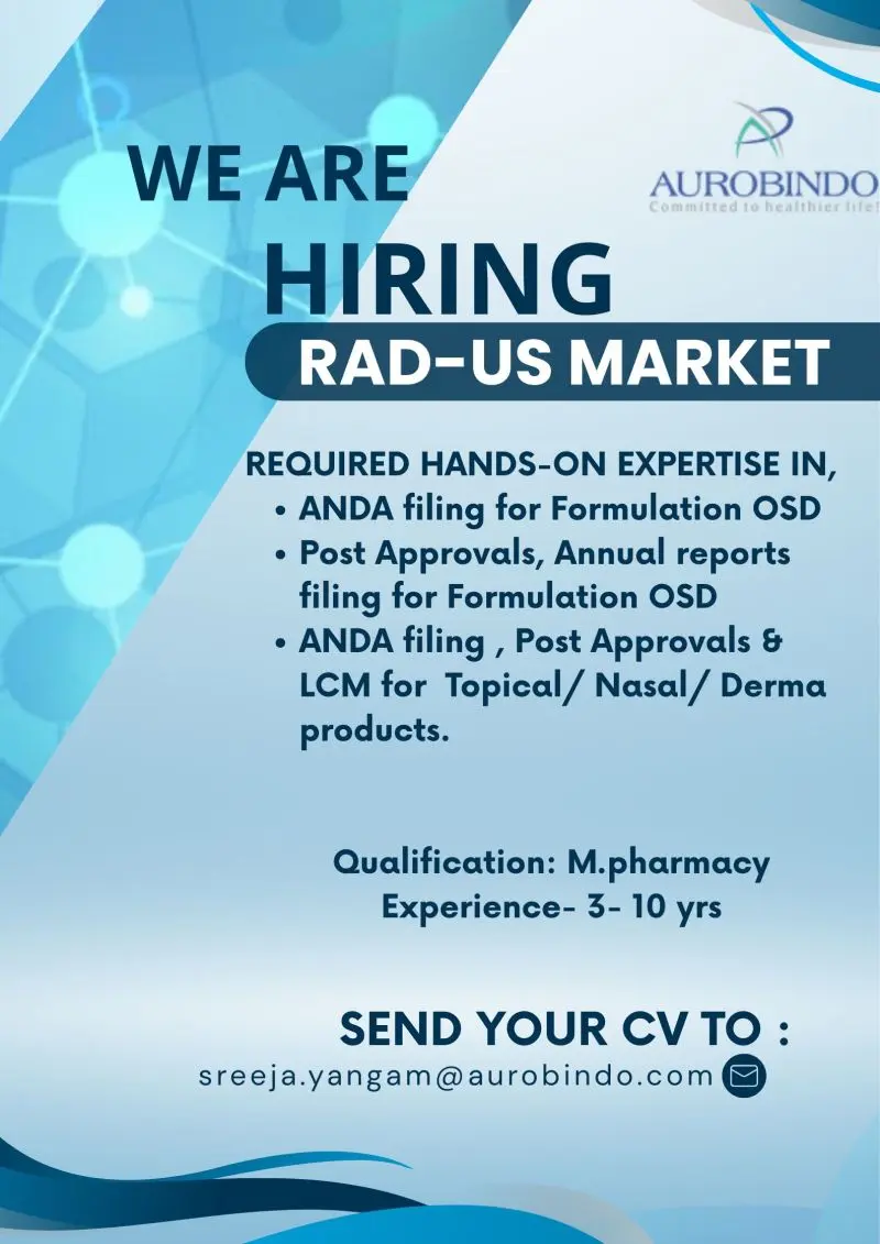Aurobindo Pharma is actively hiring experienced professionals for Regulatory Affairs roles focused on the US market, offering excellent career opportunities for candidates with 3 to 10 years of experience in ANDA filing, lifecycle management, and post-approval submissions. These roles are ideal for M.Pharm graduates aiming to build a strong career in global regulatory affairs within formulation and specialty dosage segments such as OSD, topical, nasal, and dermatological products.