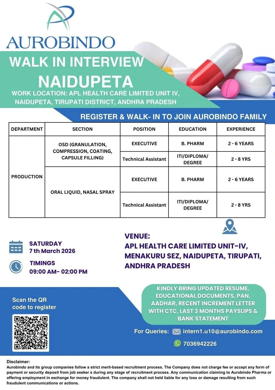 B.Pharm & ITI Production Executive/Technical Assistant vacancies (2–8 yrs) at Aurobindo Naidupeta. Walk-in 07 March 2026.