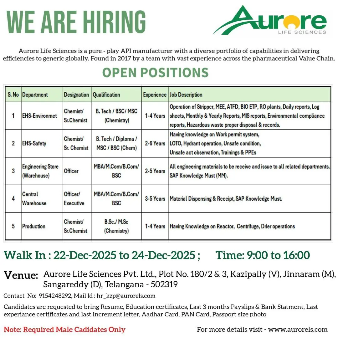 Aurore Life Sciences hiring Chemist, EHS & Warehouse roles for BSc/MSc/BTech candidates in Telangana. Walk-in Dec 22–24.