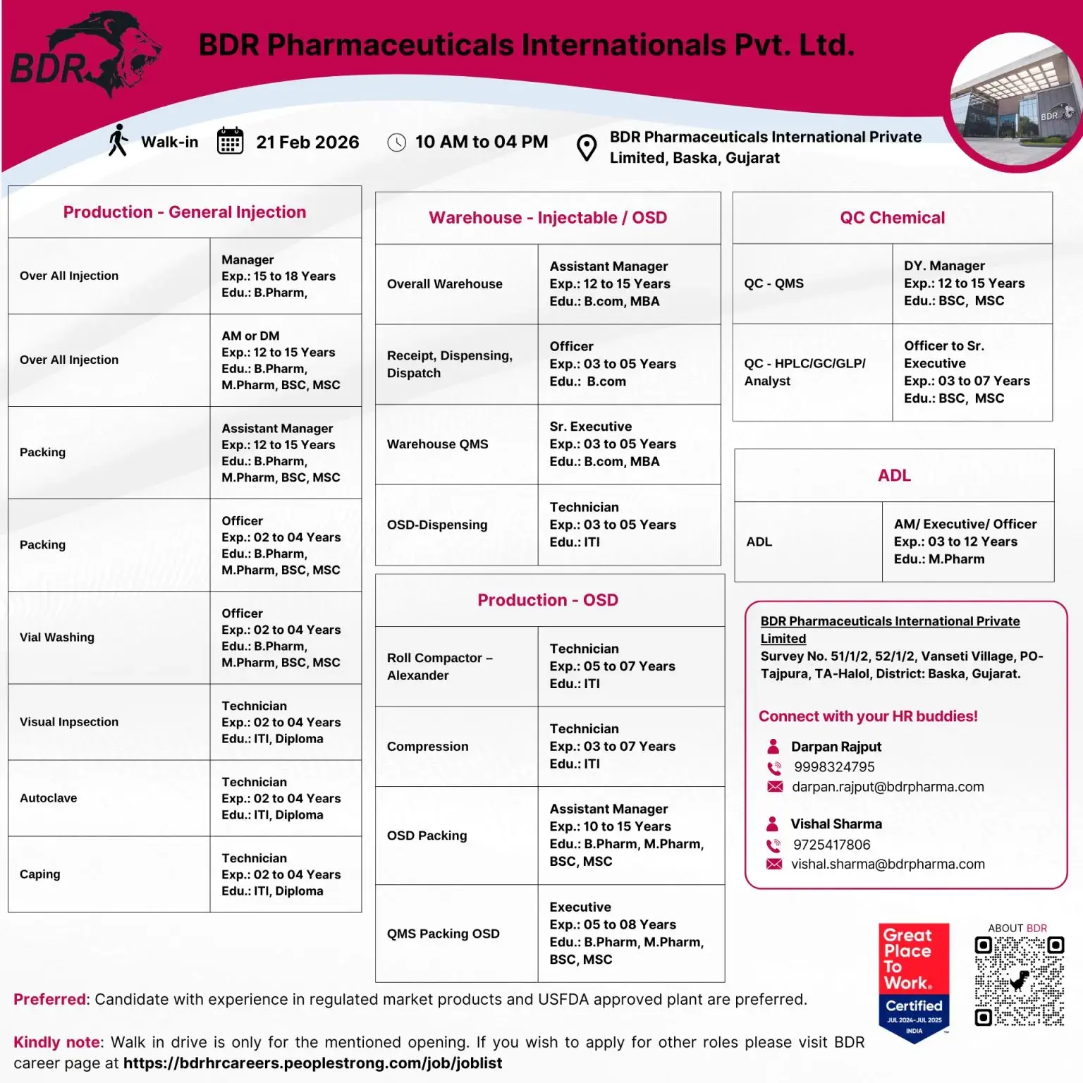 BDR Pharmaceuticals International Pvt. Ltd. is conducting a walk-in drive for multiple positions across Production (OSD & Injectables), Warehouse, Quality Control, ADL, and QMS functions at its Gujarat manufacturing facility. Professionals with experience in regulated pharmaceutical plants, especially USFDA-approved facilities, are strongly encouraged to attend.