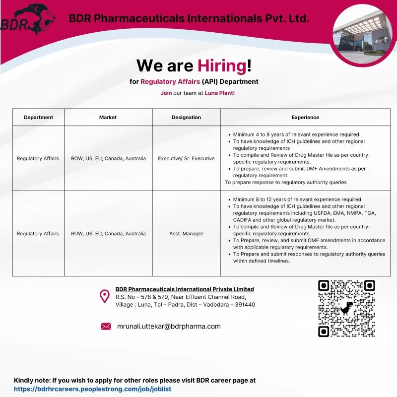 BDR Pharmaceuticals International Private Limited has announced multiple openings in its Regulatory Affairs (API) department at the Luna manufacturing plant near Vadodara. This hiring drive is aimed at experienced regulatory professionals with strong exposure to global markets including ROW, US, EU, Canada, and Australia. The roles focus on Drug Master File (DMF) preparation, lifecycle management, and regulatory correspondence for API dossiers, offering an opportunity to work in a globally regulated pharmaceutical environment.