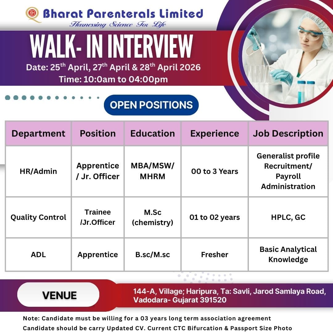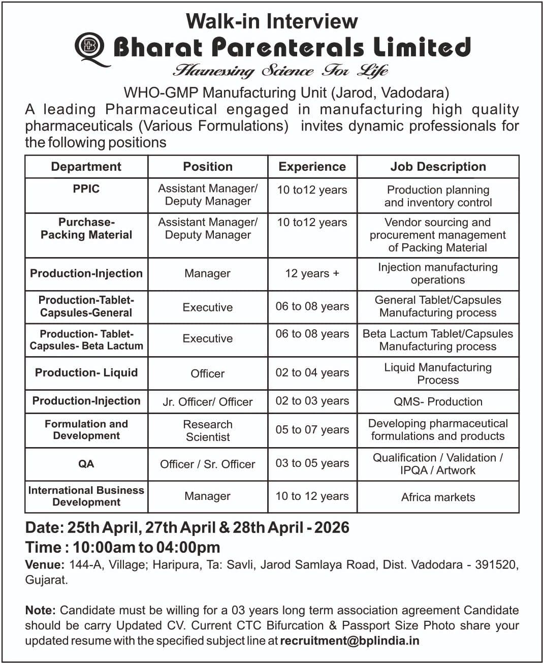 • Job Location: Bharat Parenterals Limited, Vadodara, Gujarat