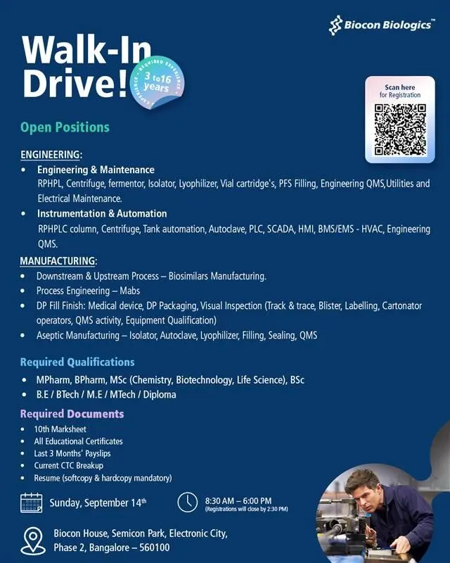 Biocon Biologics hiring 3–16 positions in pharma, engineering, and manufacturing. Walk-in at Bangalore, Sept 14, 2025. Apply now!