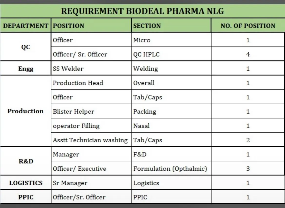 Biodeal Pharma is expanding its operations and inviting qualified, passionate pharma professionals to join its growing team in NLG (Nalgonda). With multiple openings across Quality Control, Production, R&D, Engineering, Logistics, and PPIC, this is an excellent opportunity to work with a reputed pharmaceutical organization that values innovation, compliance, and excellence in manufacturing.