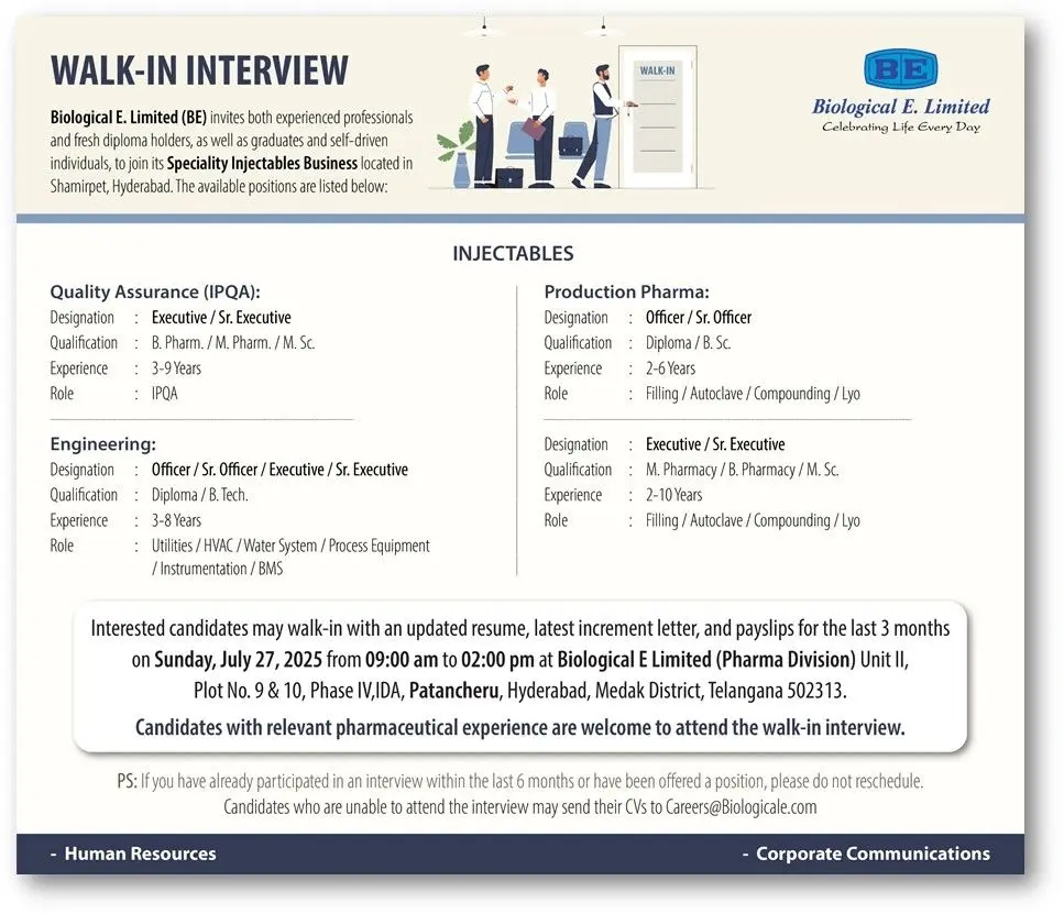 Biological E has a strong legacy in healthcare, offering a dynamic workplace with world-class infrastructure and a focus on innovation. This walk-in interview opens the door for growth-oriented roles in a fast-paced injectables manufacturing environment. With multiple job openings, it’s the perfect gateway for pharma professionals to elevate their careers.