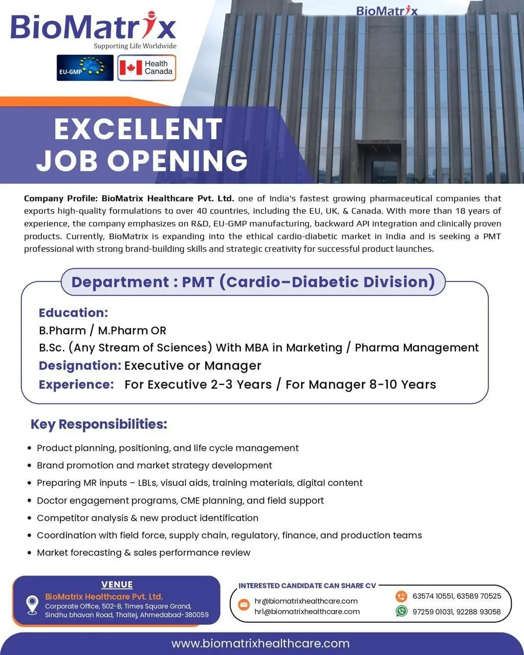 The role is based at BioMatrix Healthcare’s corporate office in Ahmedabad, Gujarat.