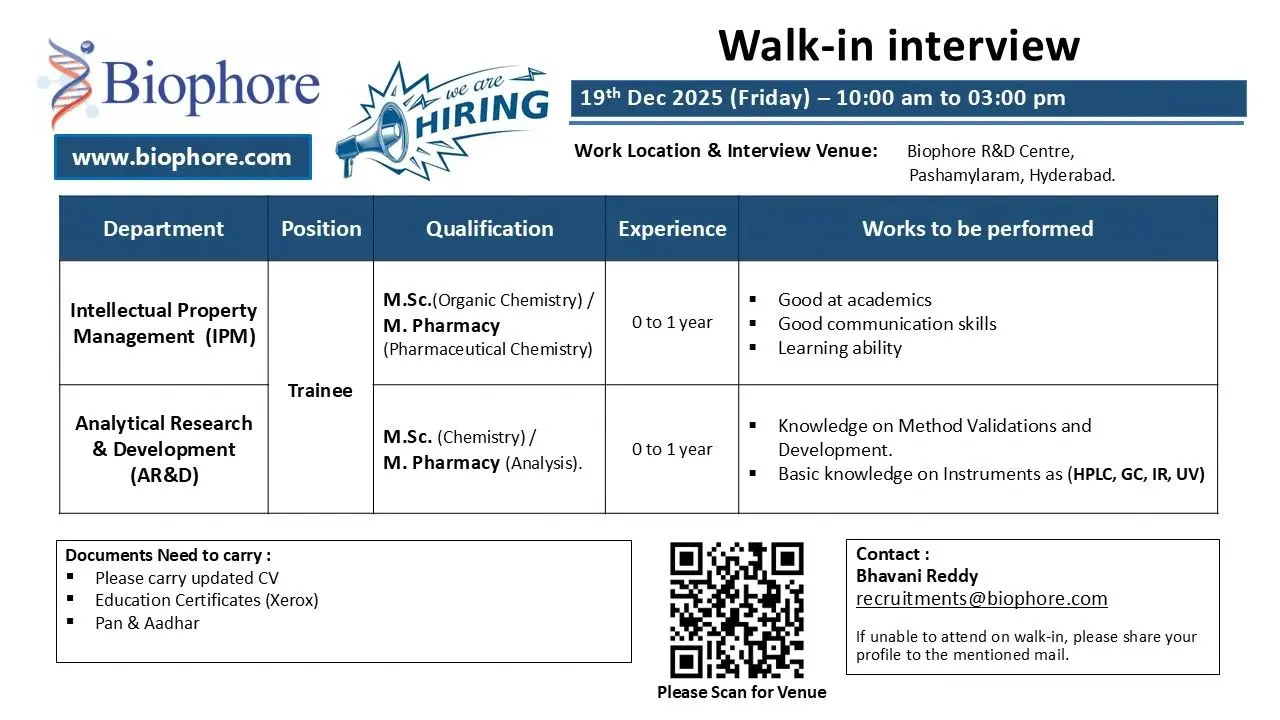 Biophore is conducting a walk-in interview at its advanced R&D Centre in Pashamylaram, Hyderabad, inviting fresh science and pharmacy graduates to begin their careers in pharmaceutical research and development. This opportunity is ideal for candidates who want hands-on exposure in intellectual property management and analytical research within a globally recognized API and drug discovery organization.