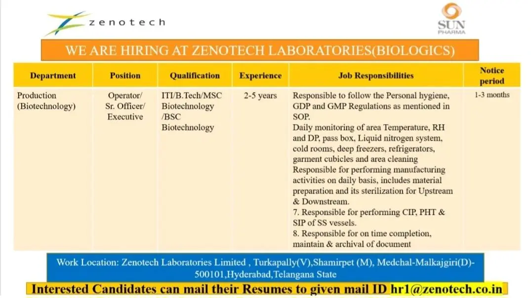 Zenotech Laboratories Limited, a part of Sun Pharma, is inviting applications for multiple openings in its Production (Biotechnology) department. Located in Shamirpet, Hyderabad, the company is offering promising roles for experienced professionals in the biotechnology domain. The current hiring drive targets candidates with hands-on experience in upstream and downstream production processes in biopharma manufacturing environments.