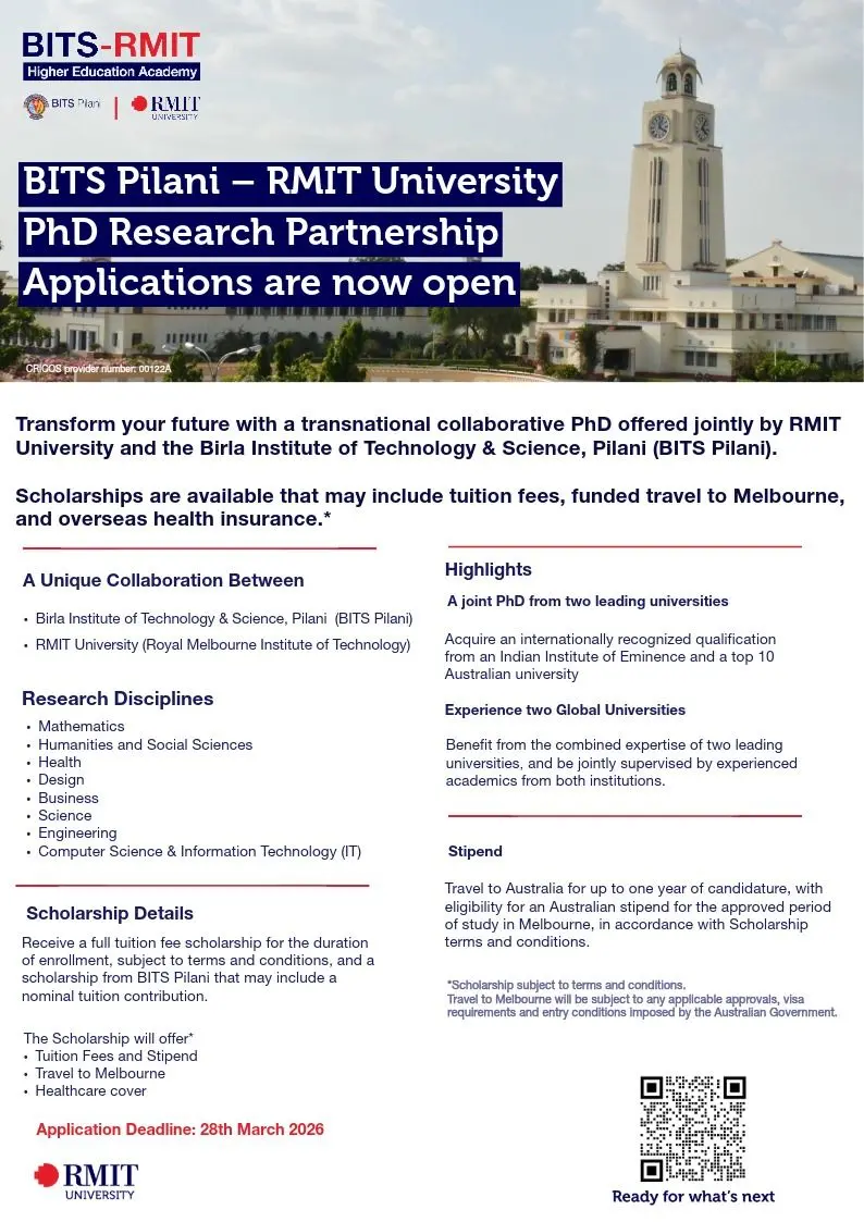 Apply for BITS Pilani RMIT PhD with scholarships, stipend & global exposure. Open to multiple disciplines. Deadline March 28, 2026.