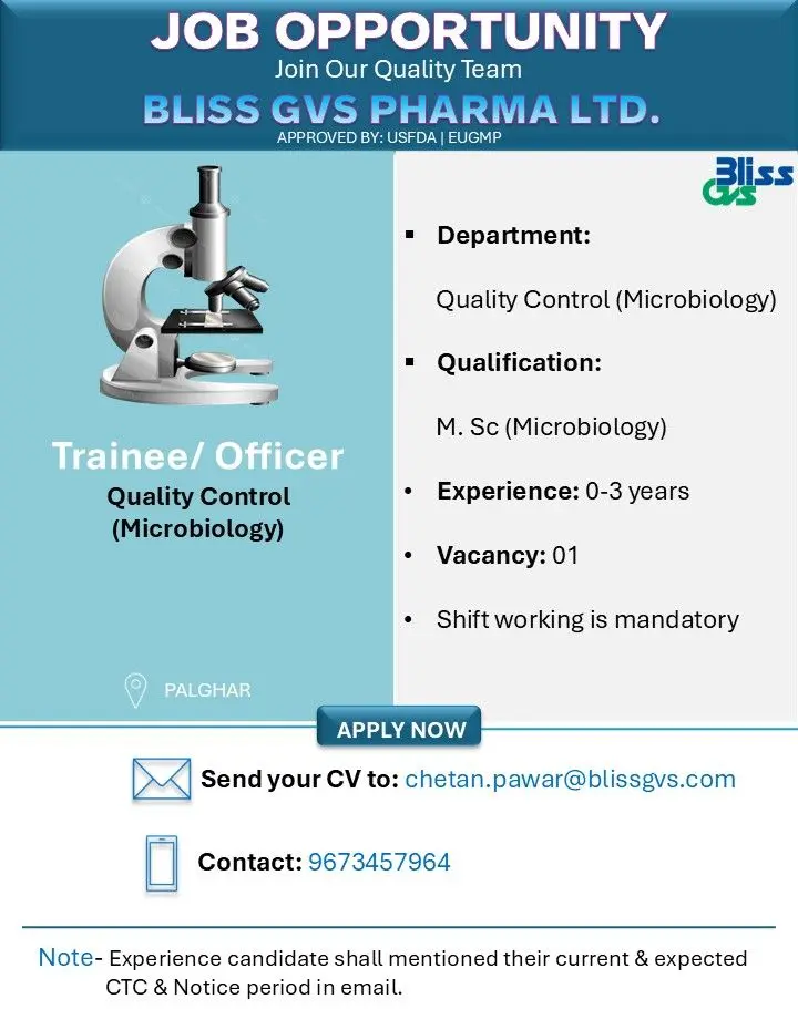 Apply now for Quality Control (Microbiology) roles at Bliss GVS Pharma Ltd, Palghar. M.Sc Microbiology candidates with 0–3 years experience eligible.