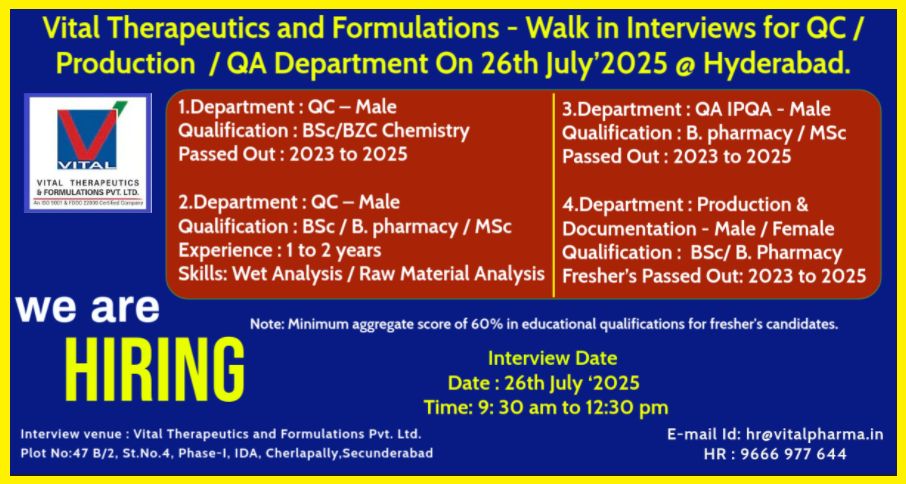 Vital Therapeutics and Formulations Pvt. Ltd., a trusted name in pharmaceutical manufacturing, is conducting a walk-in interview for multiple vacancies in the Quality Control (QC), Quality Assurance (QA), and Production departments. The company is hiring both freshers and experienced candidates with educational backgrounds in BSc, B Pharmacy, and MSc. This is a great opportunity for life science graduates looking to build a career in the pharma industry.