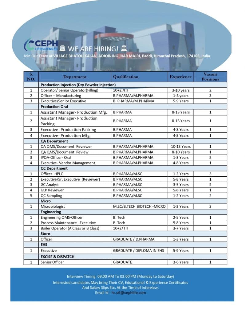 CCEPH is hiring across multiple departments at its pharmaceutical manufacturing facility in Baddi, Himachal Pradesh. This large-scale hiring drive includes roles in Production (Injectables & Oral), Quality Assurance (QA), Quality Control (QC), Microbiology, Engineering, Store, EHS, and Dispatch. With openings for candidates ranging from 1 to 13 years of experience, this opportunity is ideal for professionals at different career stages seeking growth in regulated pharmaceutical environments.
