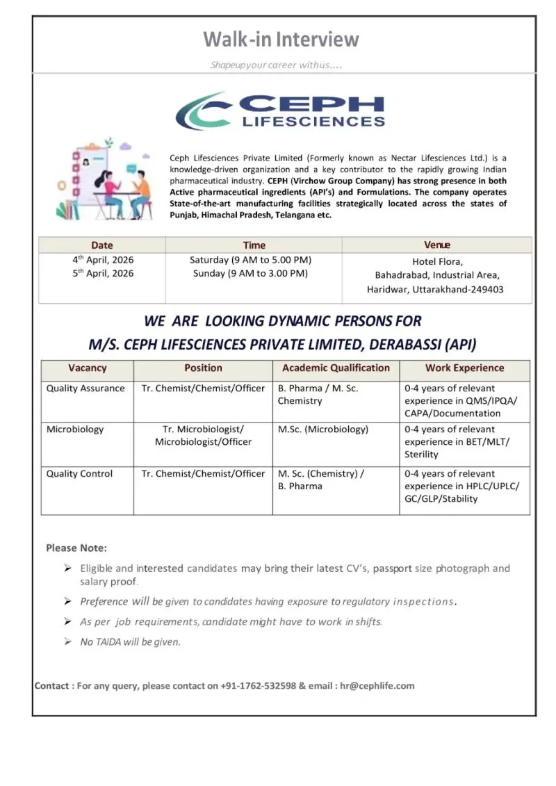 Ceph Lifesciences Private Limited, a Virchow Group company, is conducting a walk-in interview drive for multiple roles across Quality Assurance (QA), Quality Control (QC), and Microbiology departments for its API manufacturing unit in Derabassi. The hiring drive is open for both freshers and candidates with up to 4 years of experience, making it a strong opportunity for early-career professionals in pharmaceutical quality and microbiology domains.