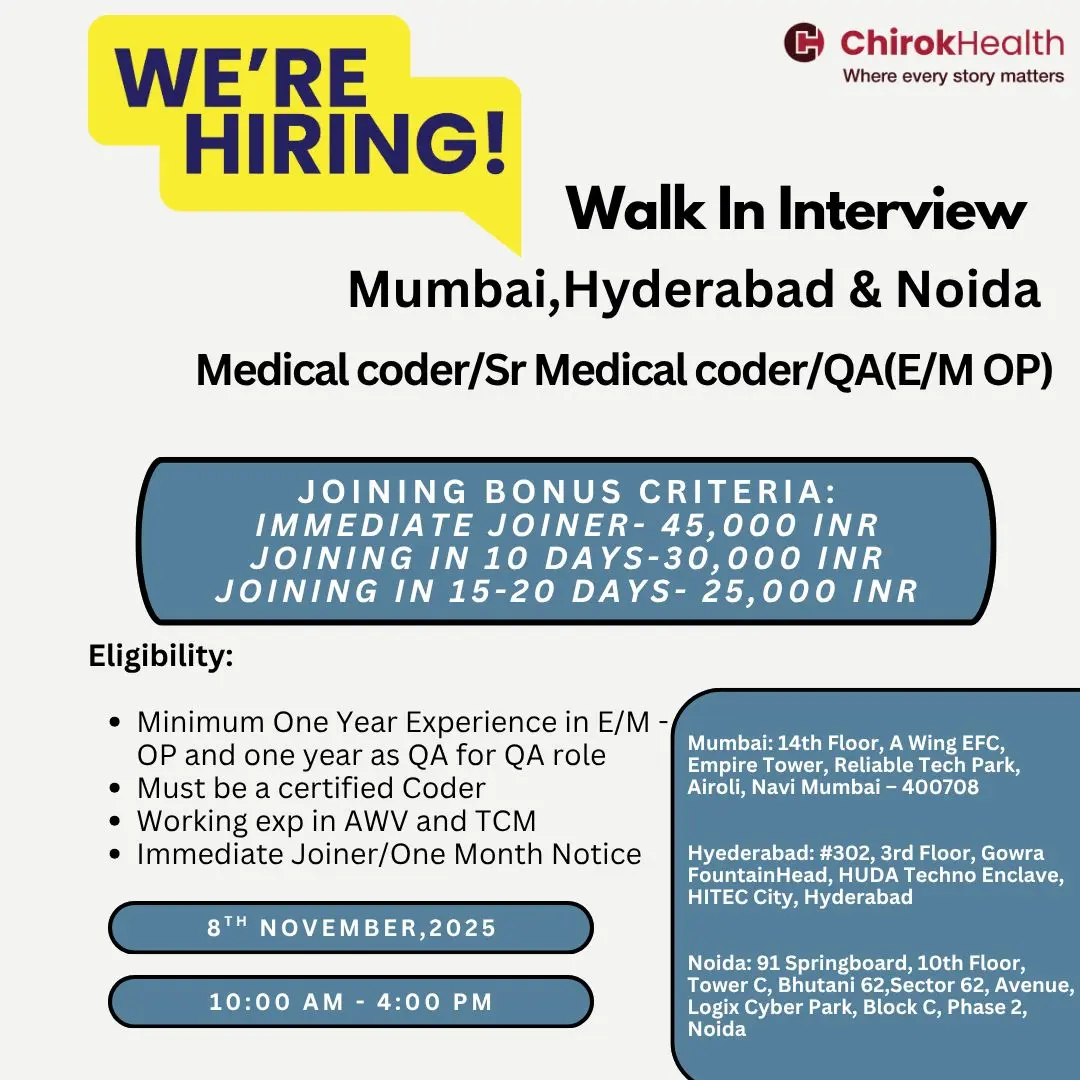 Join an organization that values precision, compassion, and growth. ChirokHealth, a leading name in healthcare information management and medical coding, invites experienced Medical Coders, Senior Medical Coders, and QA professionals (E/M OP) to its Walk-In Interview Drive on 8th November 2025 across Mumbai, Hyderabad, and Noida locations.