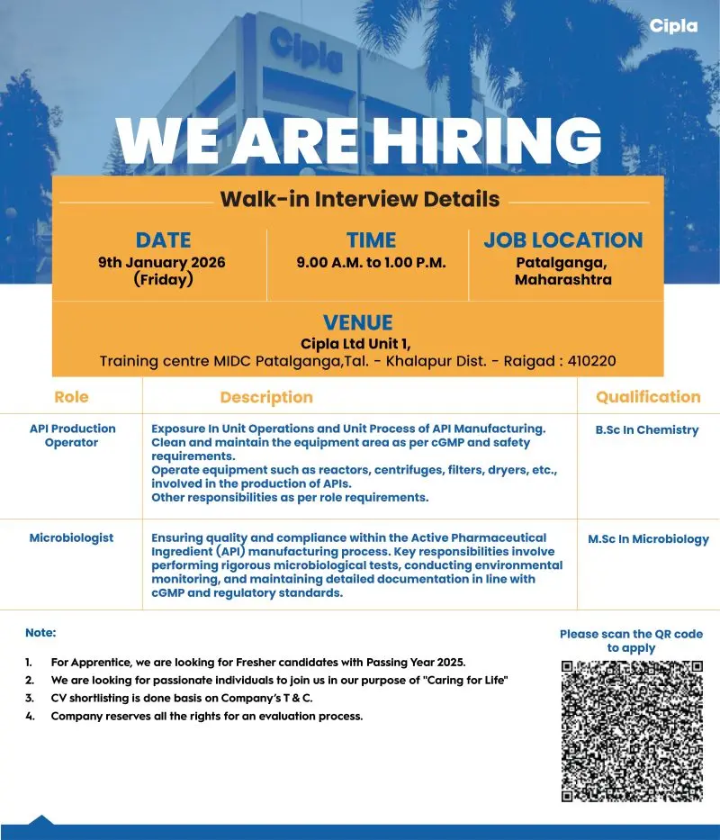 Cipla has announced a walk-in interview for freshers at its Patalganga manufacturing facility in Maharashtra. This hiring drive is open for candidates interested in building a long-term career in Active Pharmaceutical Ingredient (API) manufacturing and microbiology operations. The opportunity is ideal for science graduates and postgraduates who want hands-on exposure to regulated pharmaceutical manufacturing environments governed by cGMP and global quality standards.