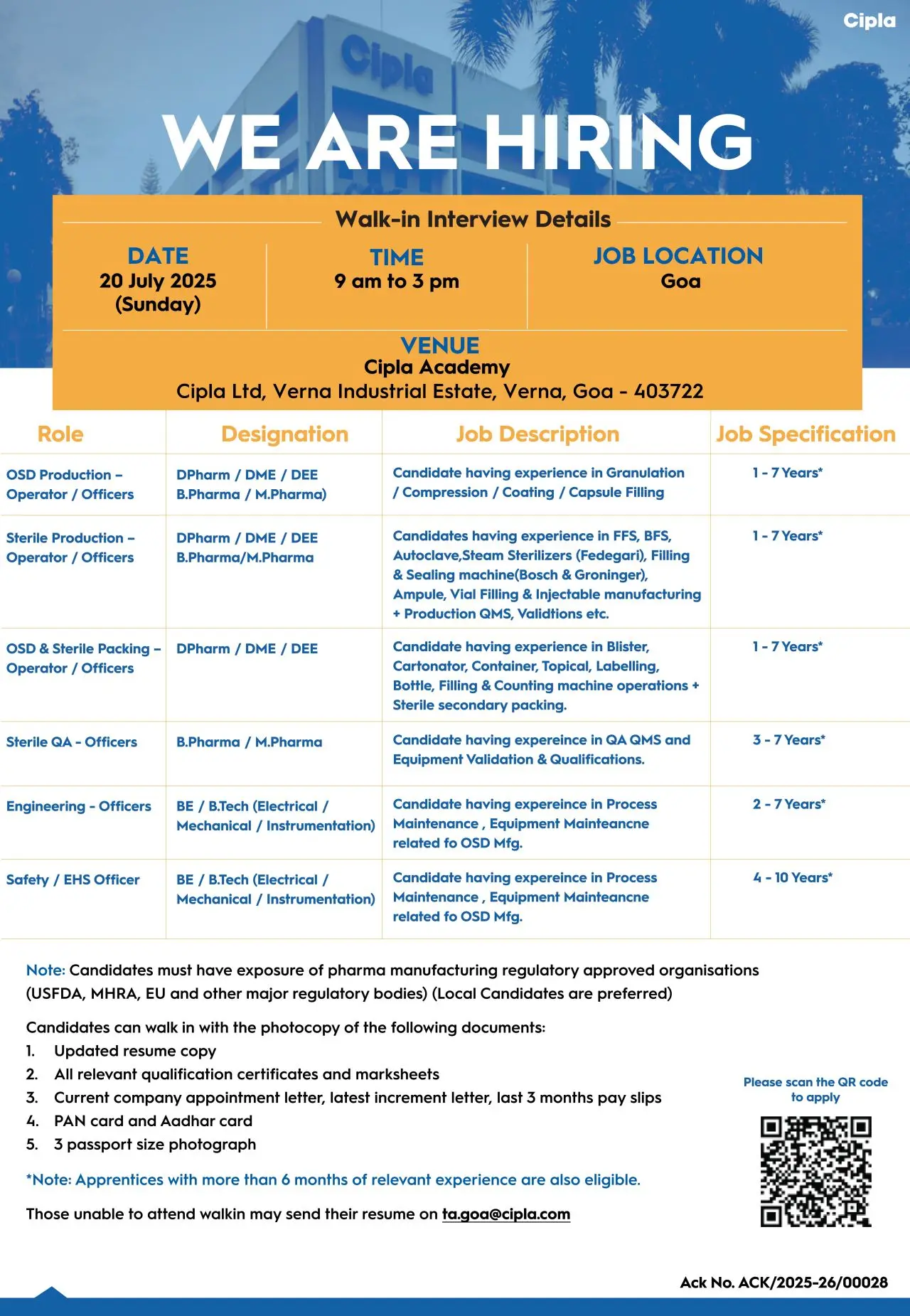 Cipla is hiring for multiple pharma roles in Goa! Attend walk-in interviews on 20 July 2025. Openings for DPharm, BPharm, MPharm graduates with 1–10 years experience.