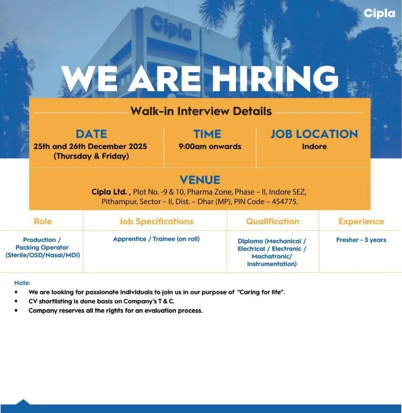 Cipla walk-in interview for Production & Packing Operators in Indore. Diploma freshers to 3 years experience eligible. Apply now.