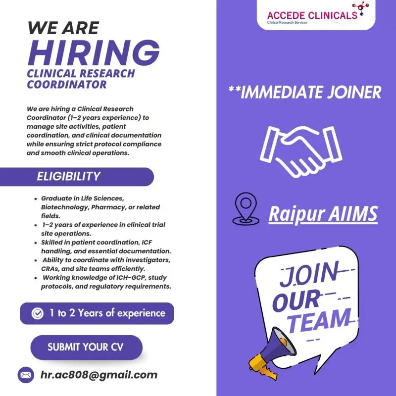 - Accede Clinicals Hiring Clinical Research Coordinator at AIIMS Raipur