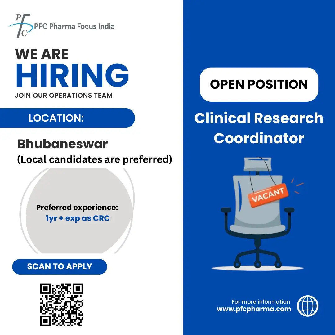 PFC Pharma Focus India is hiring Clinical Research Coordinators in Bhubaneswar. Life Science graduates with 1+ year CRC experience preferred. Apply now.