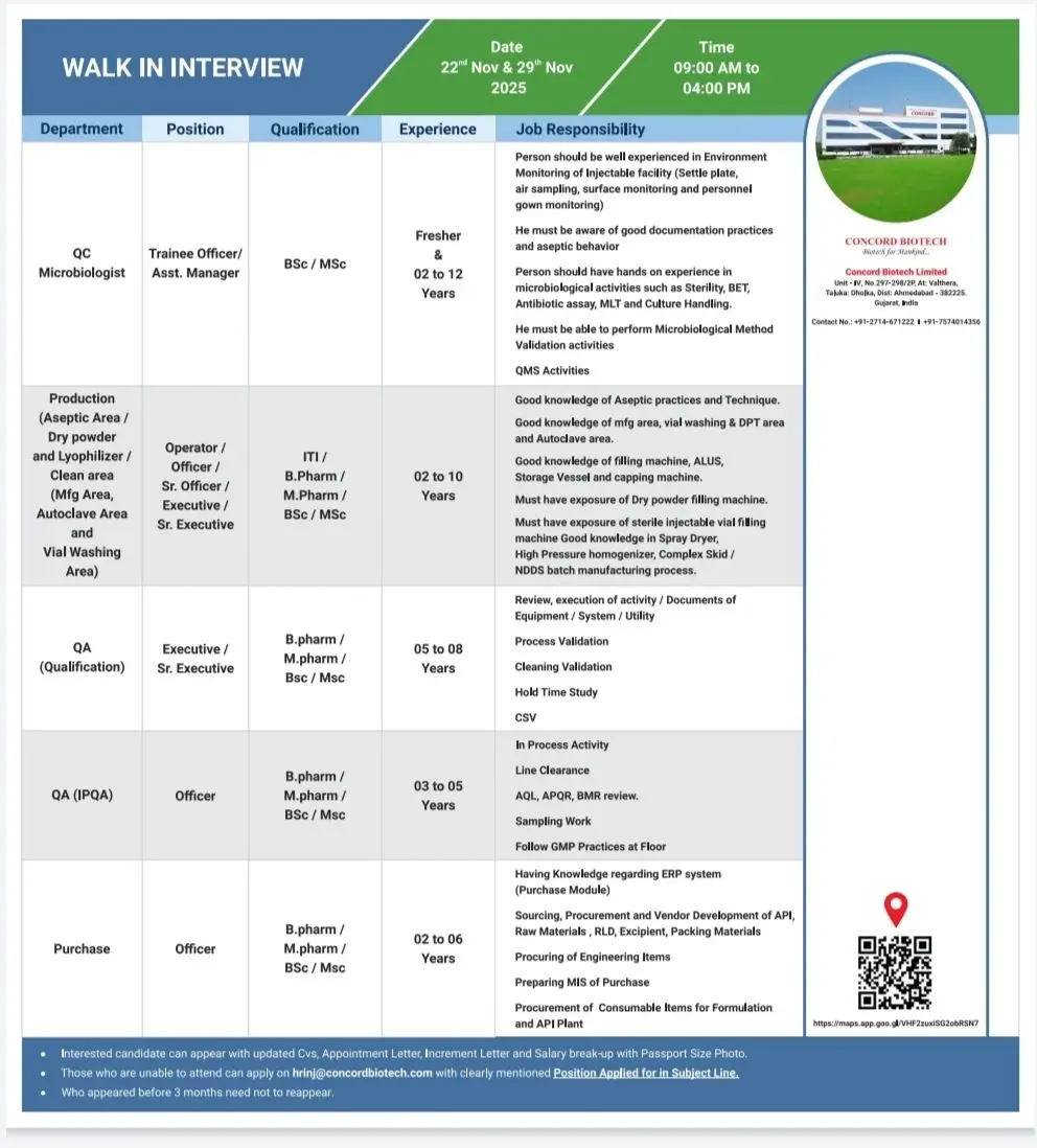 Concord Biotech hiring BSc/MSc/B.Pharm/M.Pharm candidates for QC Micro, QA, Production and Purchase roles. Walk-in on 22 & 29 Nov 2025.