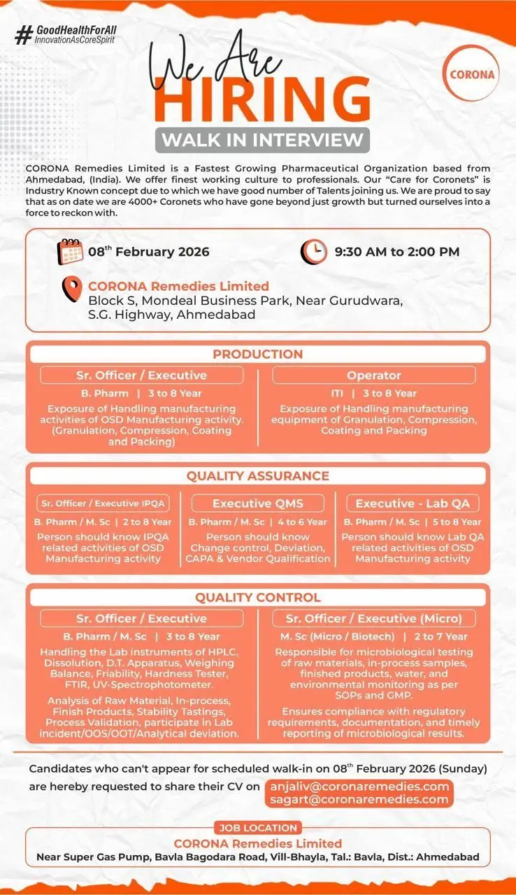 Corona Remedies Limited has announced a large-scale walk-in interview for experienced pharmaceutical professionals across Production, Quality Assurance, and Quality Control departments. This hiring drive is scheduled for 08 February 2026 at Ahmedabad and is aimed at strengthening the company’s oral solid dosage (OSD) manufacturing and quality operations. The openings are suitable for B.Pharm, M.Sc, and Microbiology professionals with hands-on exposure to regulated pharma manufacturing environments.