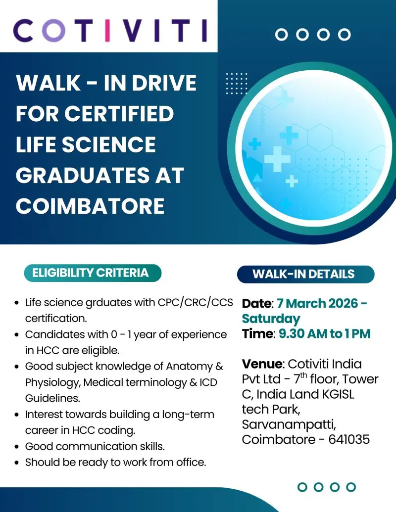 This is an excellent opportunity for life science graduates who want to build a long-term career in medical coding, healthcare risk adjustment, revenue cycle management, and healthcare analytics. The walk-in interview will take place on 7 March 2026 (Saturday) from 9:30 AM to 1:00 PM at Cotiviti India Pvt Ltd, India Land KGISL Tech Park, Saravanampatti, Coimbatore.